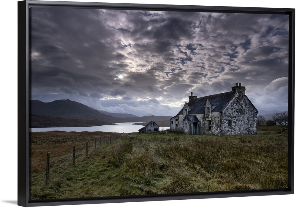 <p>Abandoned Croft House overlooking Loch Siophort and the Harris Hills, Arivruaich, Isle of Lewis, Outer Hebrides, Scotland, United Kingdom, Europe</p>