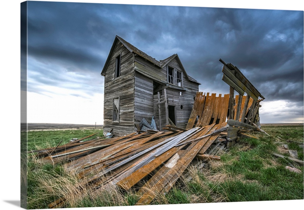 <p>Abandoned house on the prairies with storm clouds overhead at sunset; Val Marie, Saskatchewan, Canada</p>
