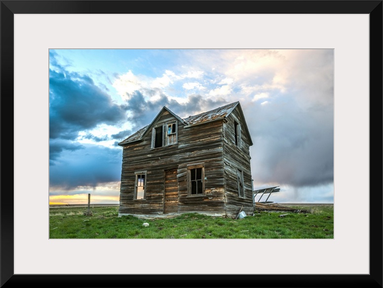 <p>Abandoned house on the prairies with storm clouds overhead at sunset; Val Marie, Saskatchewan, Canada</p>