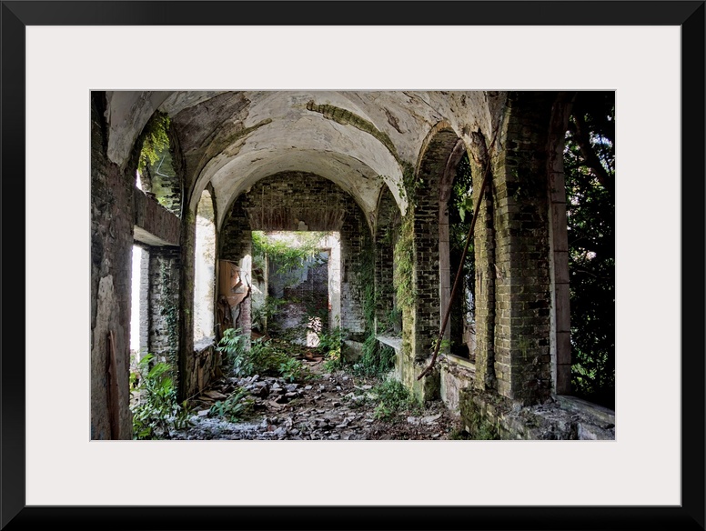 <p>Ruined abandoned overgrown interior of abandoned mansion in Abkhazia, Georgia.</p>