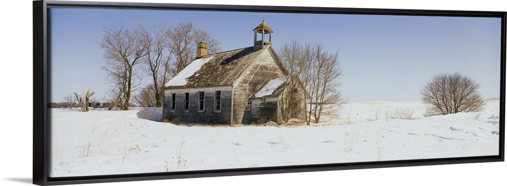 <p>A run down building is surrounded by snow covered land and bare trees.</p>