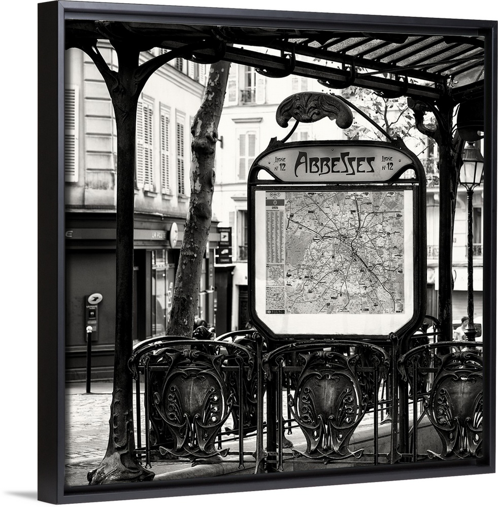 <p>A black and white photograph of the Abbesses subway station sign in Paris.</p>