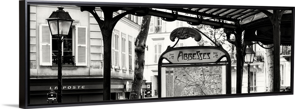 <p>A black and white photograph of the Abbesses subway station sign in Paris.</p>