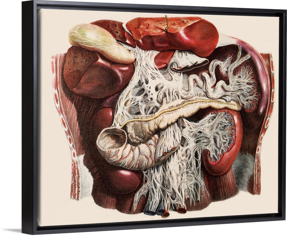 <p>Abdominal organs, historical anatomical artwork. This ventral (front) view of a dissected abdomen shows several of the organs involved in digestion. The stomach has been removed. Lobes of the liver are at upper left (orange-red) behind the gall bladder (white). The spleen is at upper right (purple-red), and the kidneys lie partially obscured to left and right. The pancreas (white, centre) extends across the front of the abdomen. Short regions of small and large intestine are at upper and lower left (grey). This illustration is taken from the 19th century French textbook The Atlas of Human Anatomy and Surgery by J. M. Bourgery and N. H. Jacob.</p>
