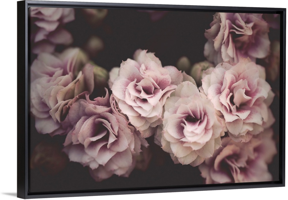 <p>Dreamlike photograph of pink and white flowers clustered together on a dark background.</p>