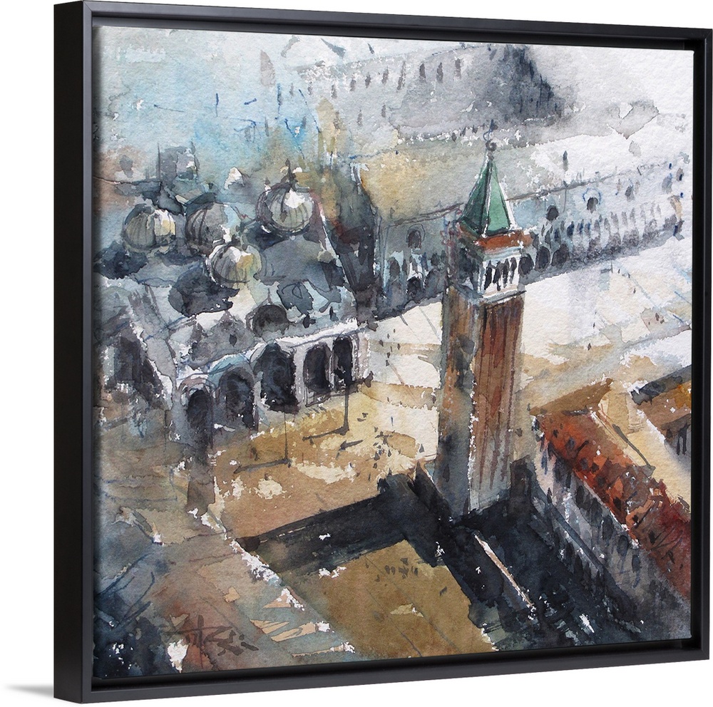 <p>Watercolor artwork of Piazzo San Marco in Venice that emphasizes strong composition and shadows.</p>