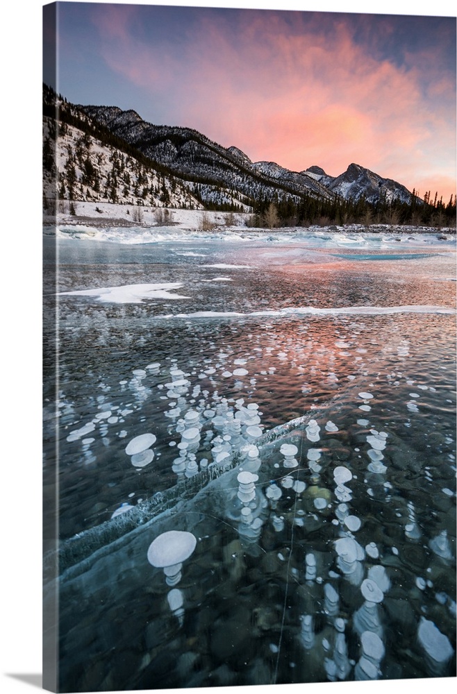 <p>Abraham Lake in winter with frozen methane bubbles in The Canadian Rockies.</p>