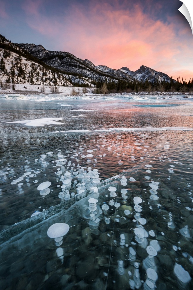 <p>Abraham Lake in winter with frozen methane bubbles in The Canadian Rockies.</p>