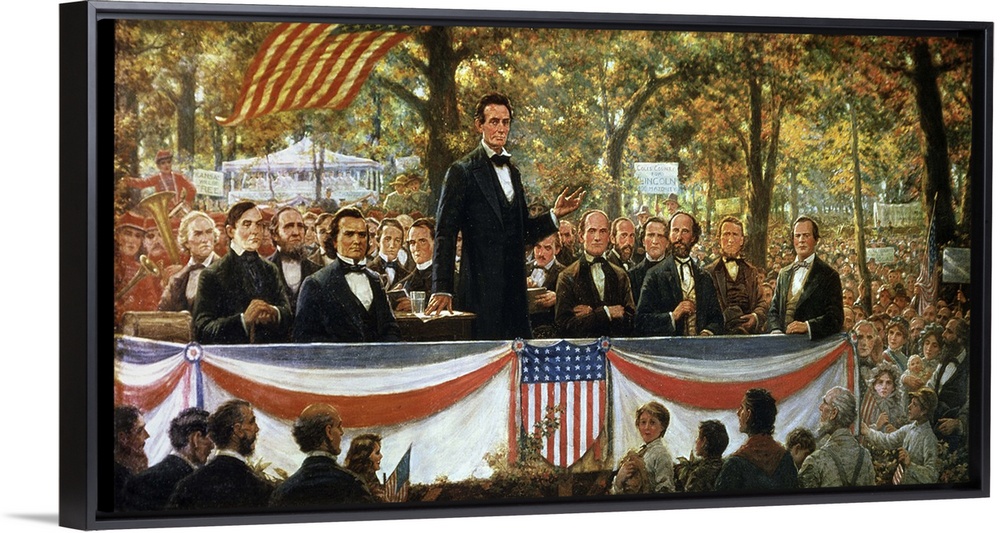 <p>XTD82767 Abraham Lincoln and Stephen A. Douglas debating at Charleston, Illinois on 18th September 1858, 1918 (oil on canvas) by Root, Robert Marshall (1863-1937); Private Collection; (add. info.: Lincoln (1809-65) 16th President of the United States of America; Douglas (1813-61)); American, out of copyright</p>