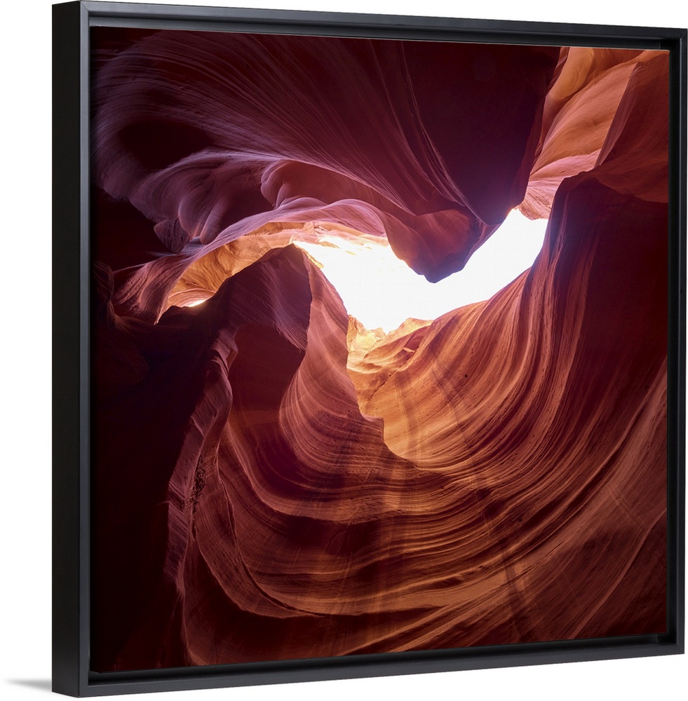 <p>An artistic photograph looking up at the opening of Antelope canyon with sunlight shining in.</p>
