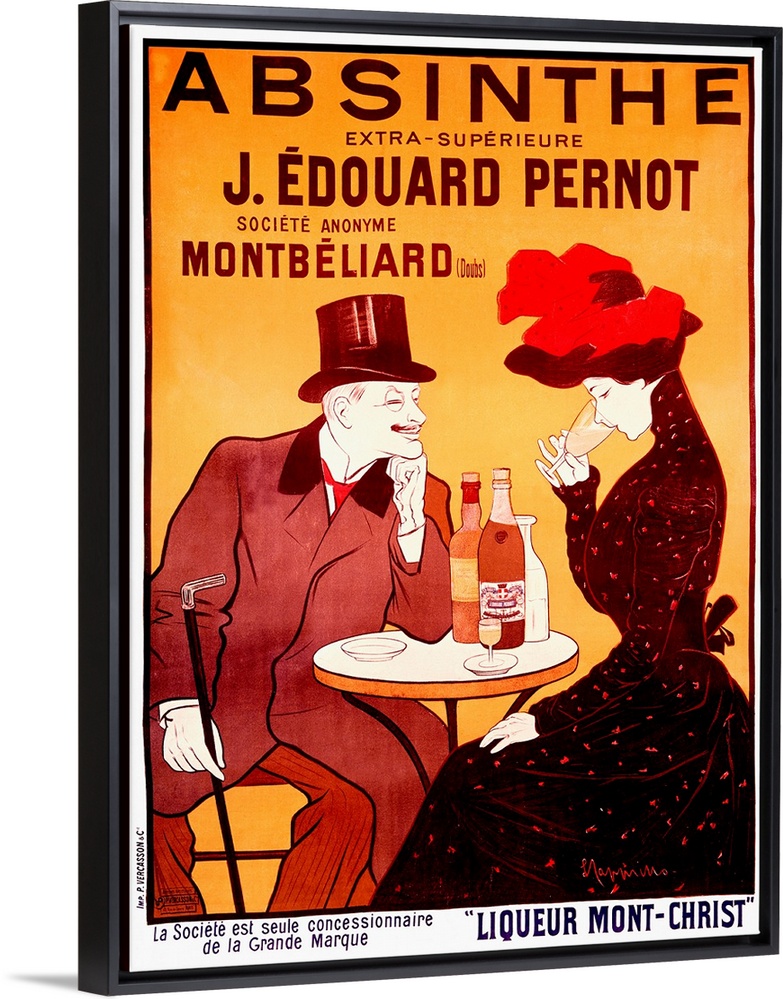 <p>Old advertising poster with a man in a top hat grinning at the lady sipping a glass of wine that is sitting across from him.</p>