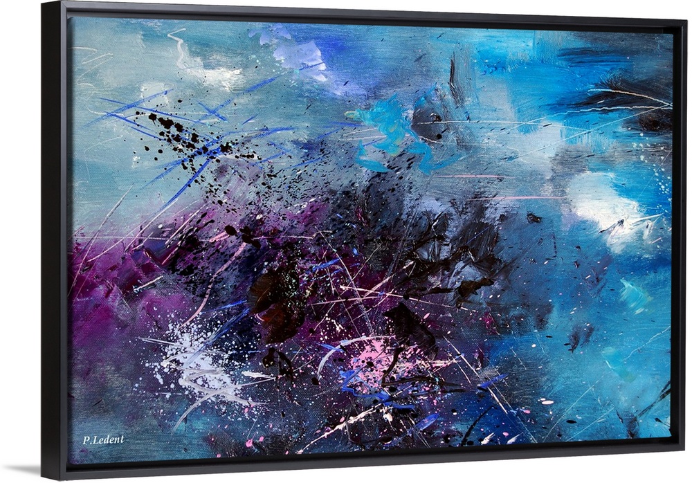 <p>Abstract painting in dark shades of black, blue, white and purple with splatters of paint overlapping.</p>