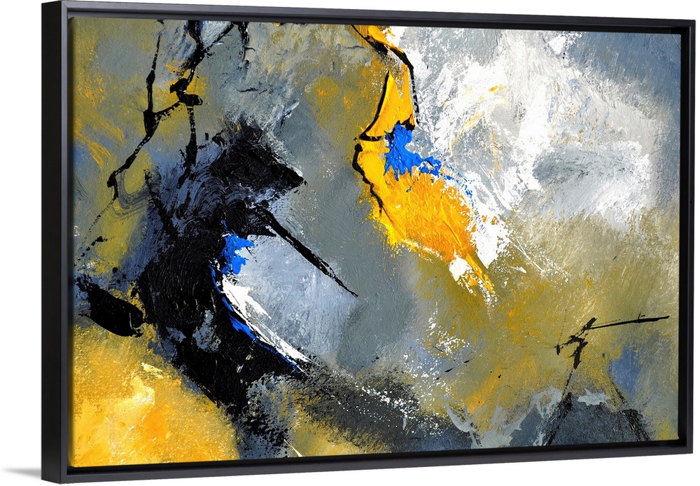 <p>Abstract painting in textured shades of black, blue, white, gray and yellow with splatters of paint overlapping.</p>