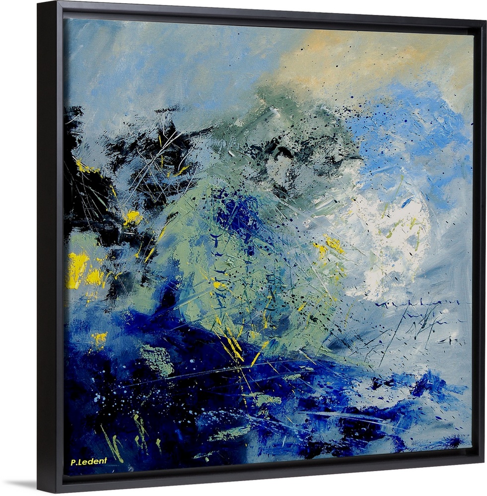 <p>A vertical abstract painting in textured shades of black, blue, white and yellow with splatters of paint overlapping.</p>