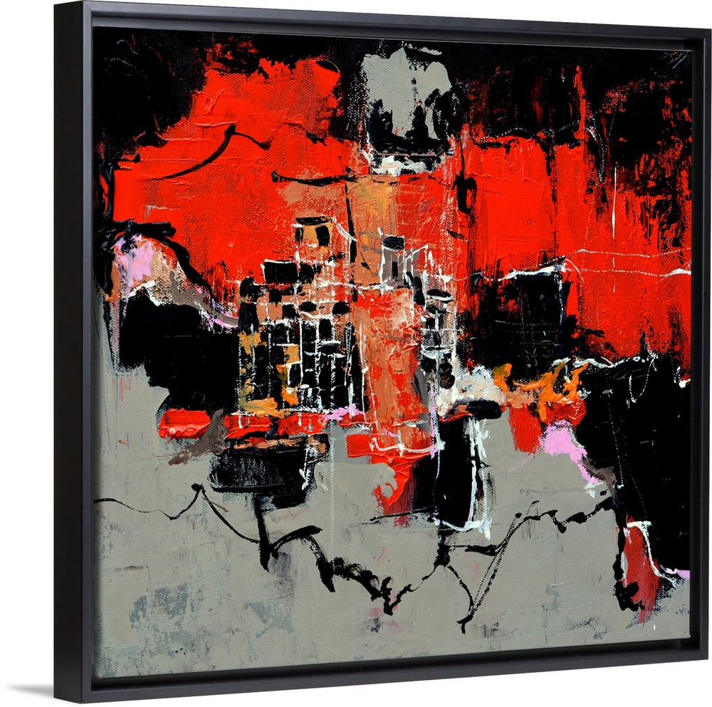 <p>A square abstract painting in shades of black, red, pink and orange with splatters of paint overlapping.</p>