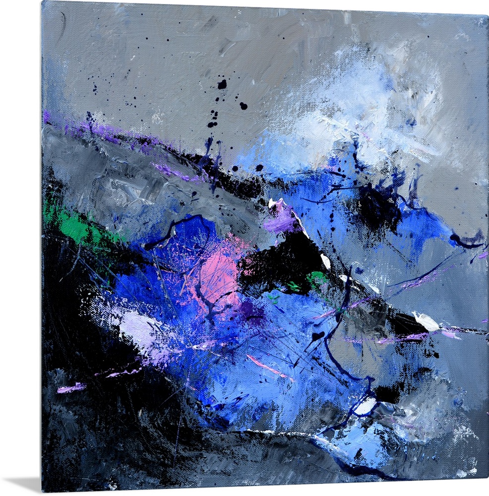 <p>A square abstract painting in textured shades of pink, blue, green and gray with splatters of paint overlapping.</p>