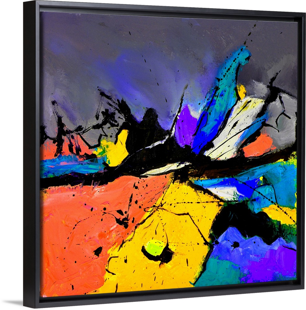 <p>A square abstract painting in vibrant shades of orange, blue, purple and yellow with splatters of paint overlapping.</p>