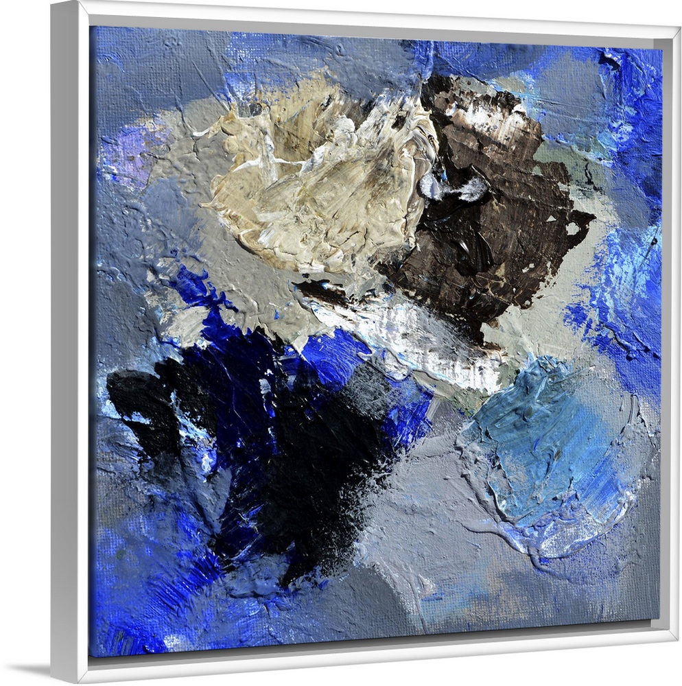 <p>A square abstract painting in textured shades of blue, brown and gray with splatters of paint overlapping.</p>