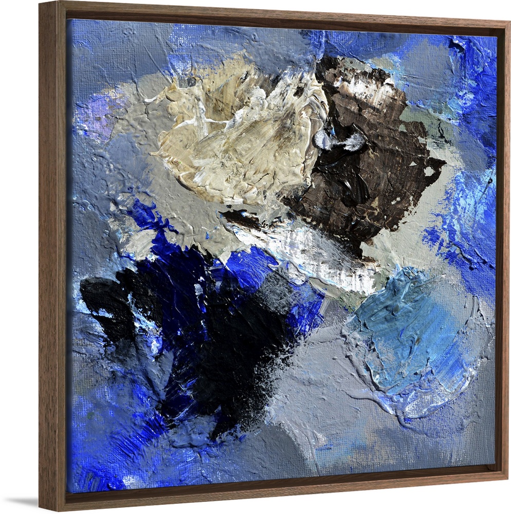 <p>A square abstract painting in textured shades of blue, brown and gray with splatters of paint overlapping.</p>
