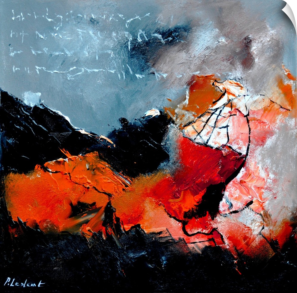 <p>A square abstract painting with deep textured colors of red and gray.</p>