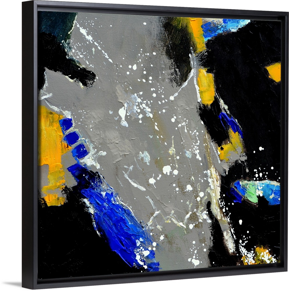 <p>A square abstract painting in textured shades of gray, blue, black and yellow with splatters of paint overlapping.</p>