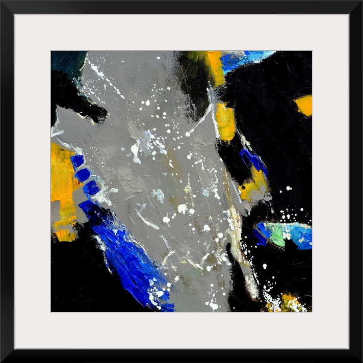 <p>A square abstract painting in textured shades of gray, blue, black and yellow with splatters of paint overlapping.</p>