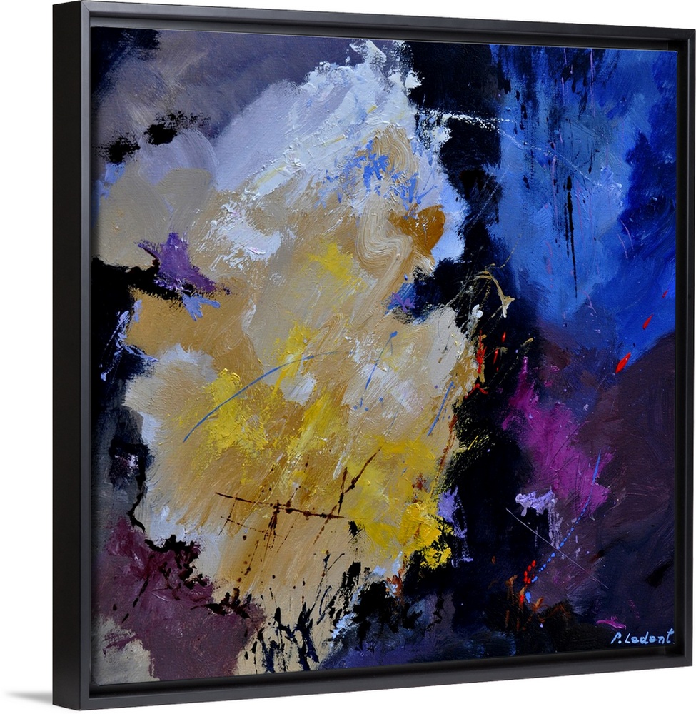 <p>Abstract painting with darken hues in shades of yellow, blue, purple, and white mixed in with black contrasting designs.</p>