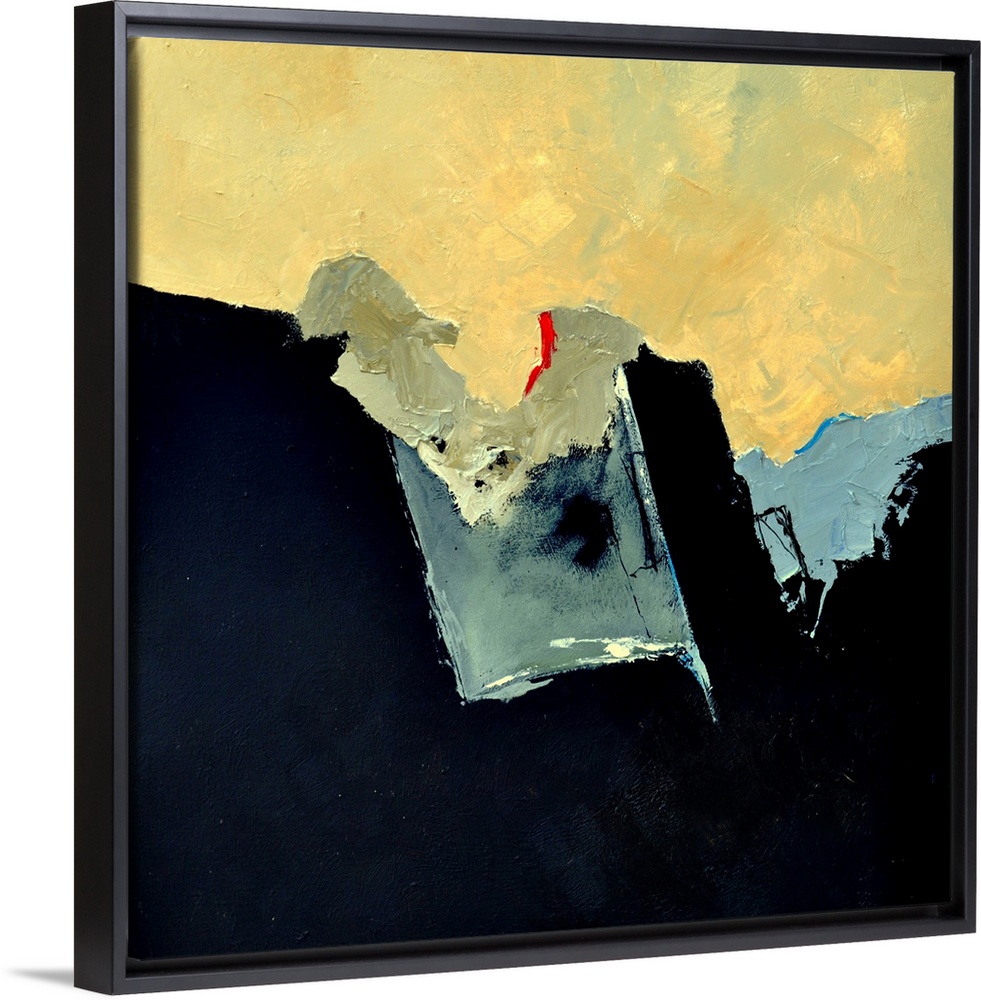 <p>A square abstract painting of colors of black, gray and yellow with hints of red in textured brush strokes and splattered paint.</p>