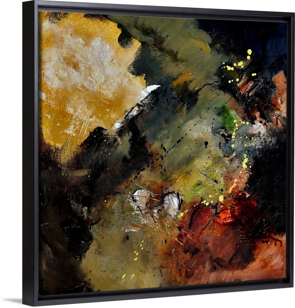<p>Square abstract painting in shades of brown, yellow, green and white mixed in with black contrasting designs.</p>