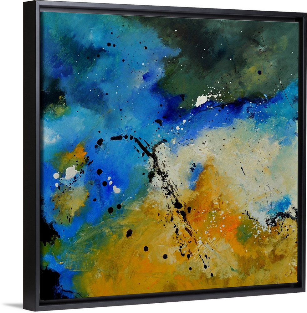 <p>Square abstract painting in shades of yellow, blue, green and white mixed in with black contrasting designs.</p>