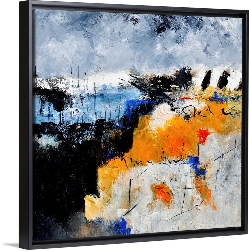 <p>A square abstract painting in shades of black, blue, white and orange with splatters of paint overlapping.</p>