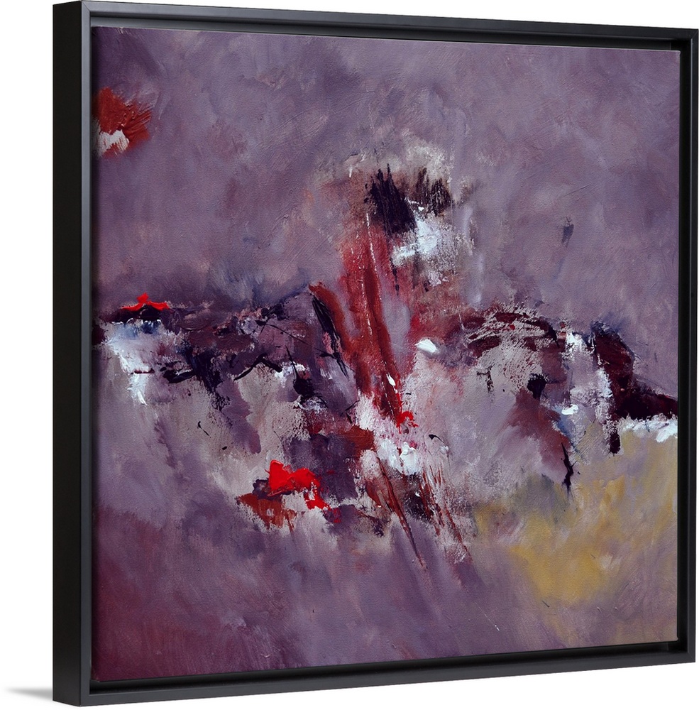 <p>A square abstract painting in darker shades of purple, red, white and yellow with splatters of paint overlapping.</p>