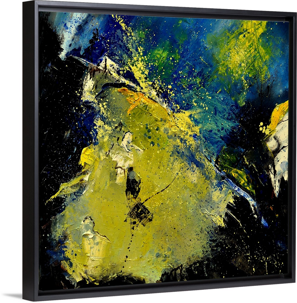 <p>A square abstract painting in textured shades of black, blue and yellow with splatters of paint overlapping.</p>