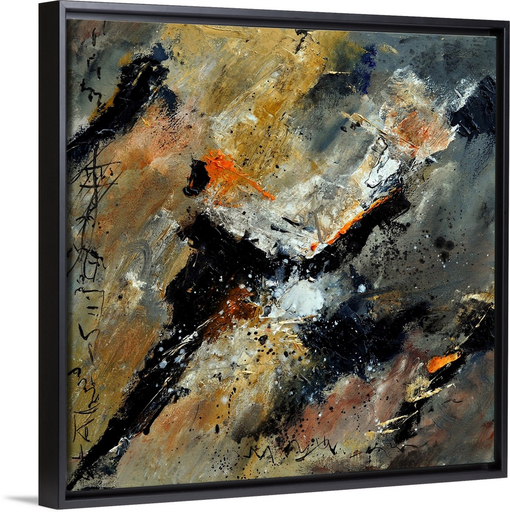 <p>A square abstract painting in dark shades of black, orange, white and brown with splatters of paint overlapping.</p>