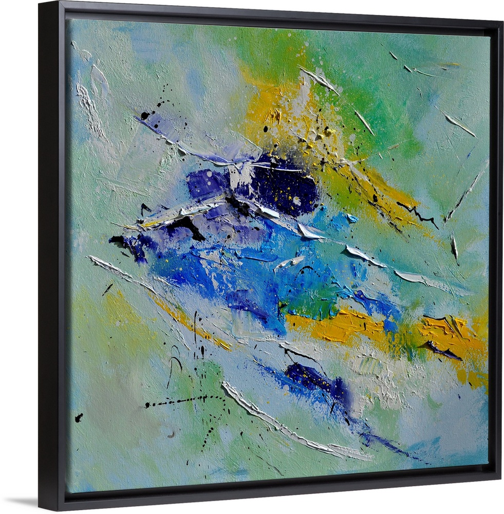 <p>A squarel abstract painting in textured shades of green, blue and yellow with splatters of paint overlapping.</p>