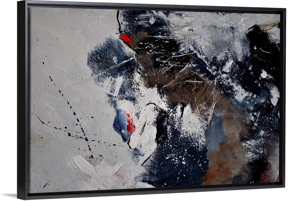 <p>An abstract painting in textured shades of black, brown, red and white with splatters of paint overlapping.</p>