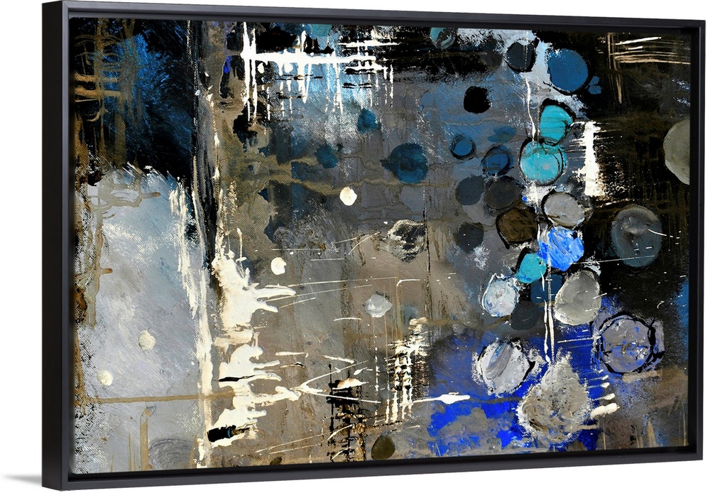 <p>Abstract painting of colors of blue, white and black in bold brush strokes and splattered paint.</p>