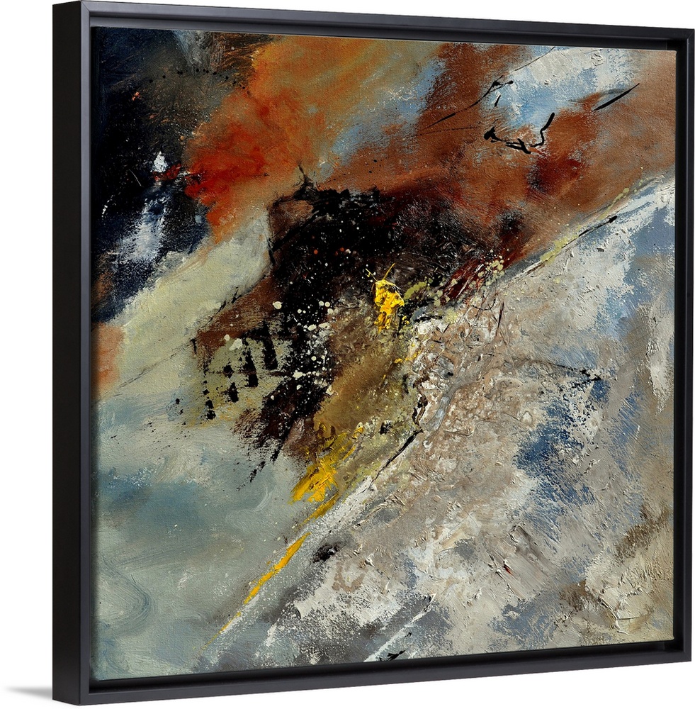 <p>A square abstract painting in dark shades of black, brown and gray with accents of yellow with splatters of paint overlapping.</p>