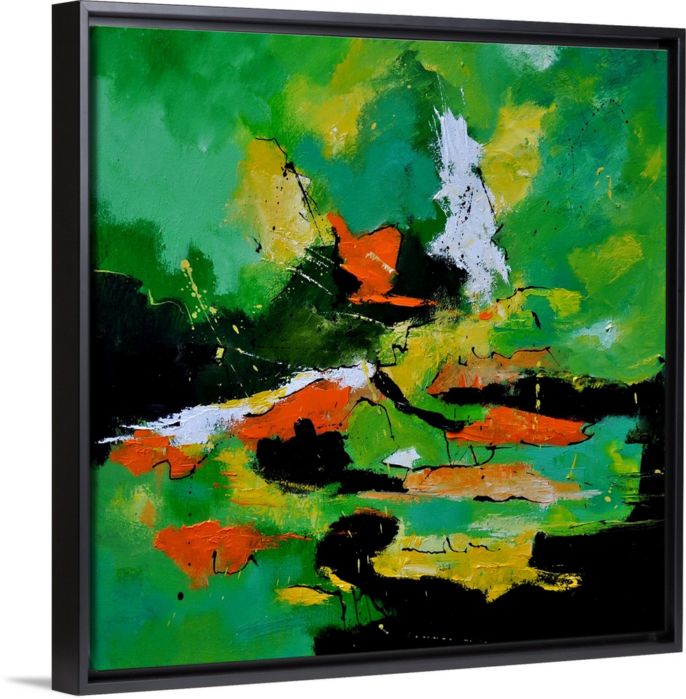 <p>A square abstract painting in textured shades of green, orange and black with splatters of paint overlapping.</p>