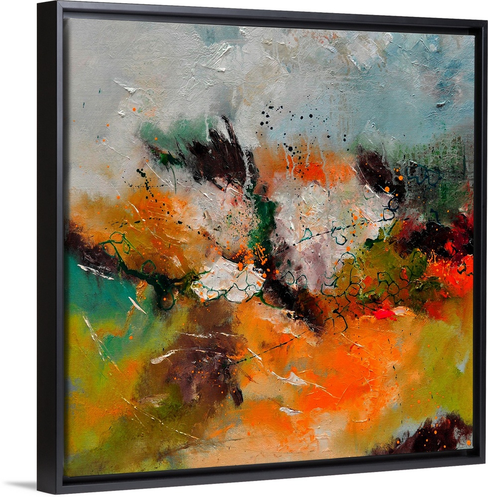 <p>A square abstract painting in textured shades of brown, orange, green and yellow with splatters of paint overlapping.</p>