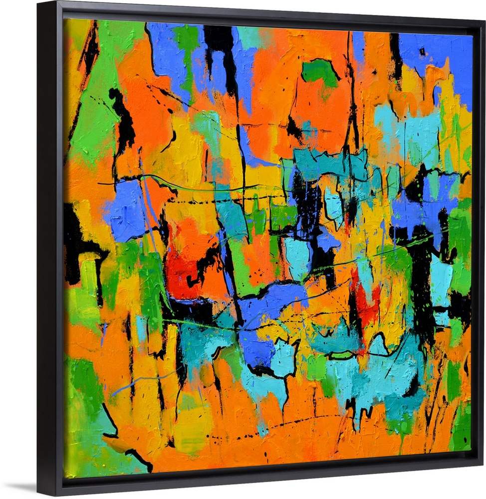 <p>A square abstract painting in textured shades of orange, blue, green and yellow with splatters of paint overlapping.</p>