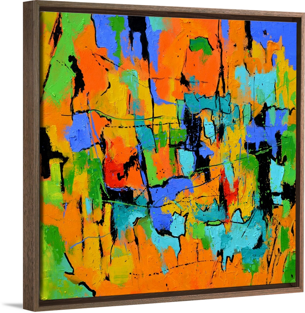 <p>A square abstract painting in textured shades of orange, blue, green and yellow with splatters of paint overlapping.</p>