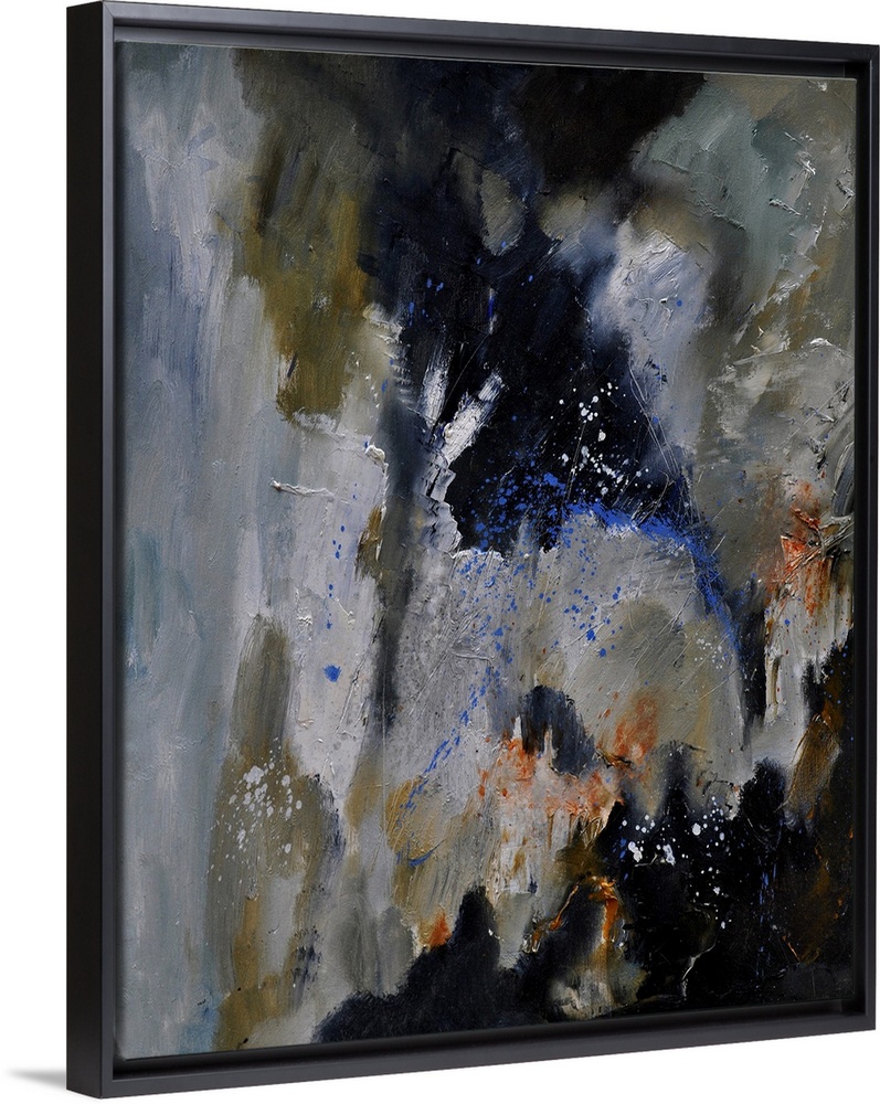 <p>Abstract painting of colors of gray, brown and blue with hints of orange in textured brush strokes and splattered paint.</p>