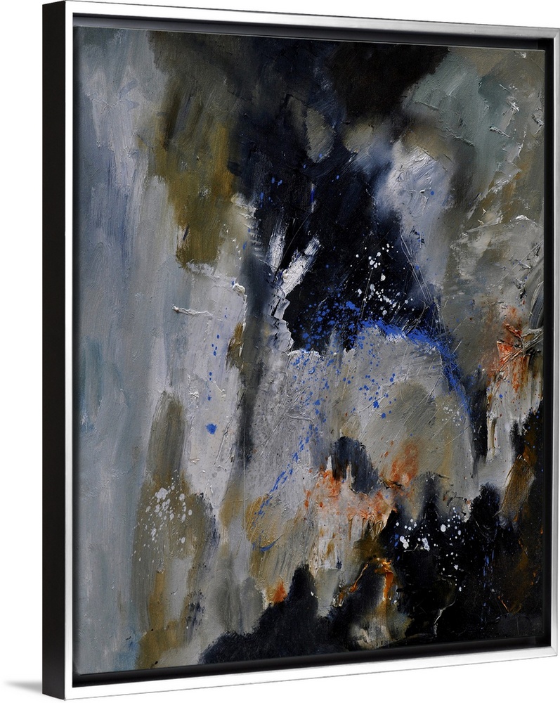 <p>Abstract painting of colors of gray, brown and blue with hints of orange in textured brush strokes and splattered paint.</p>