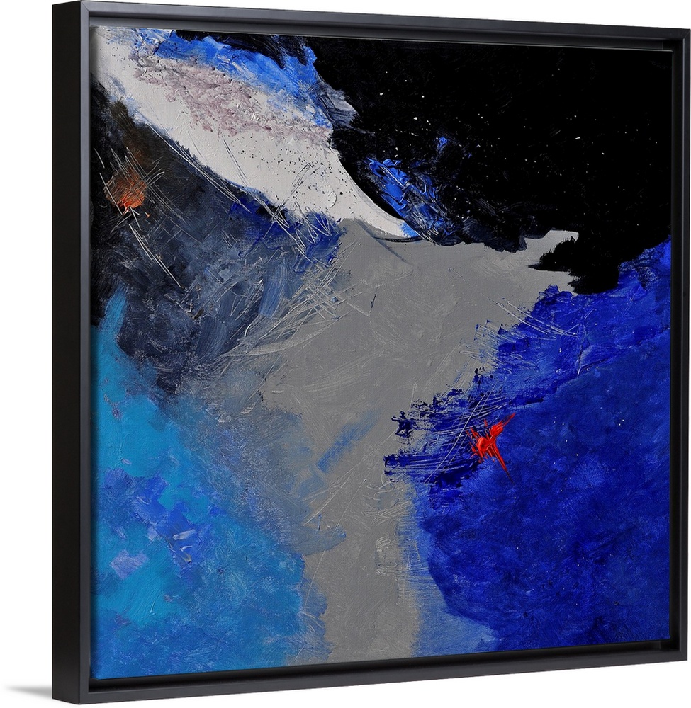 <p>A square abstract painting of colors of gray, black and blue in bold brush strokes and splattered paint.</p>
