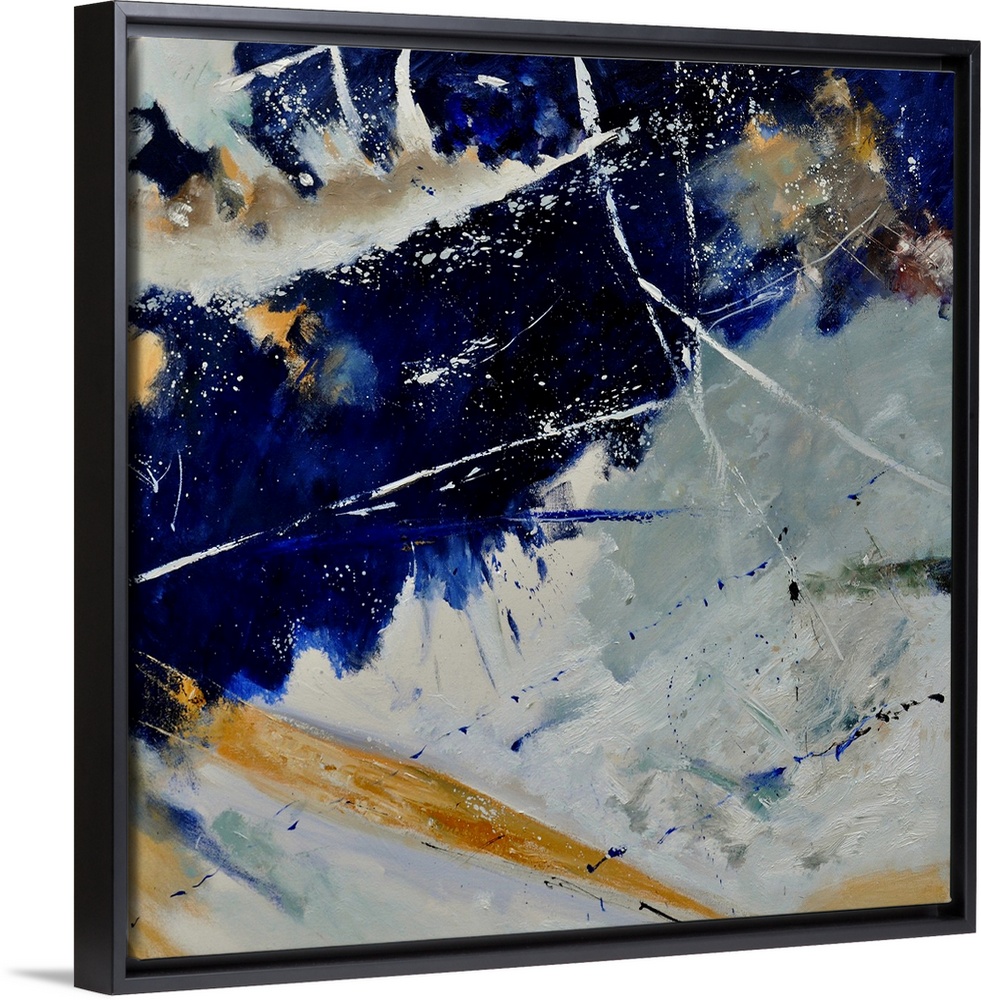 <p>A square abstract painting of colors of brown, white and blue in bold brush strokes and splattered paint.</p>