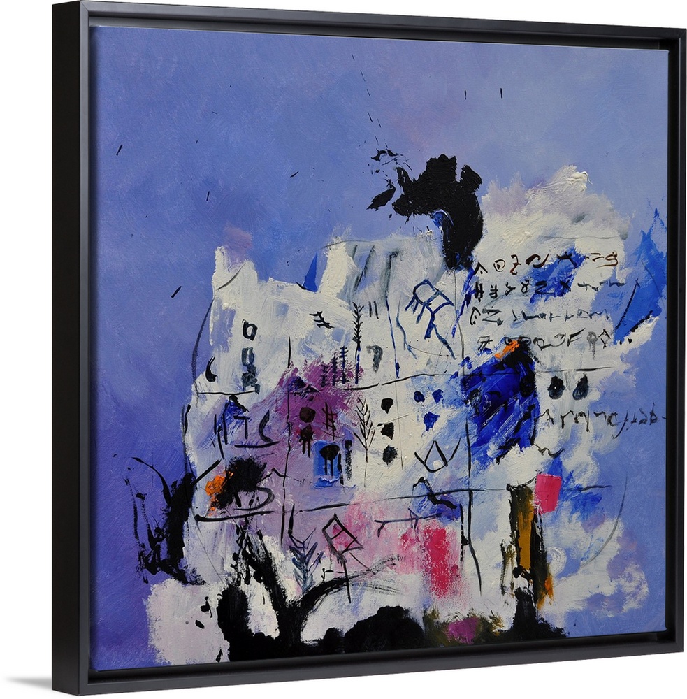 <p>Abstract painting in shades of blue, pink, purple, and white mixed in with black contrasting designs.</p>