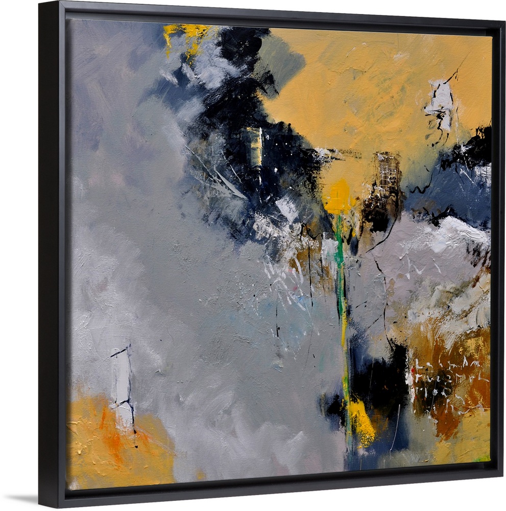 <p>A square abstract painting in dark shades of black, gray, white and yellow with splatters of paint overlapping.</p>