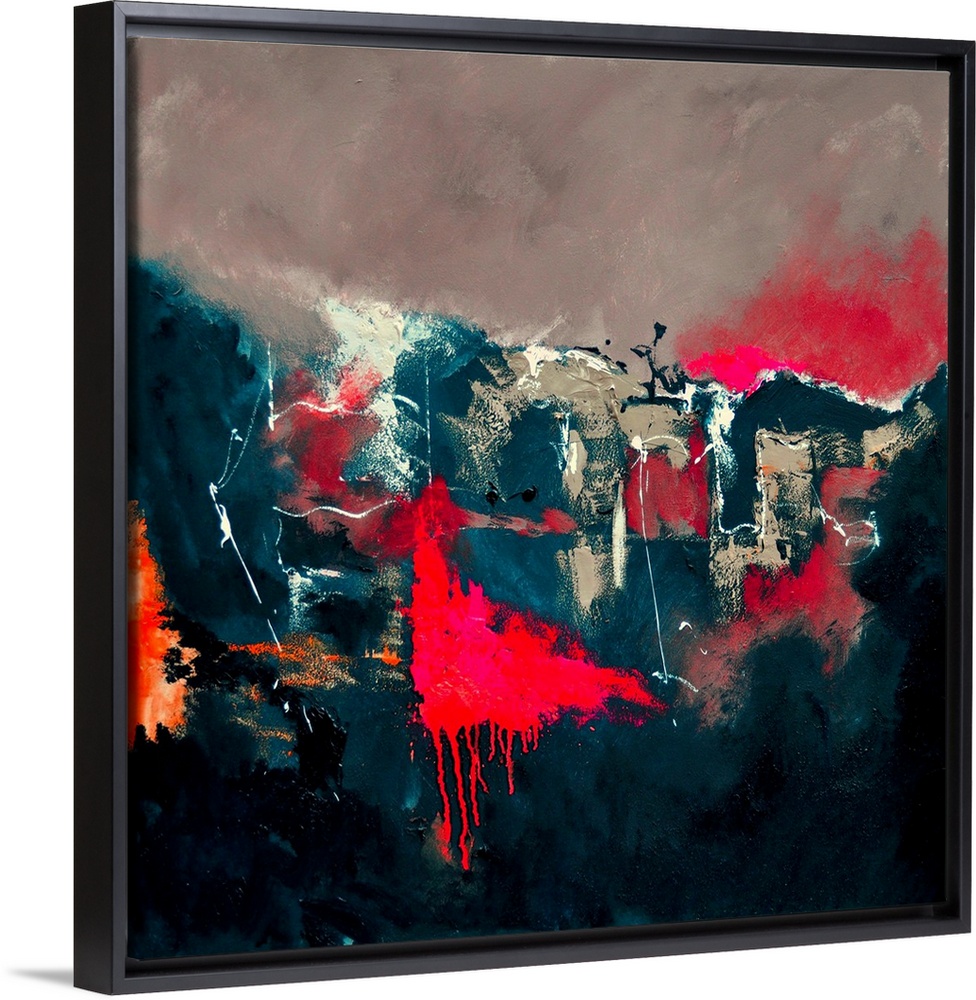 <p>A square abstract painting in dark shades of black, blue, white and red with splatters of paint overlapping.</p>