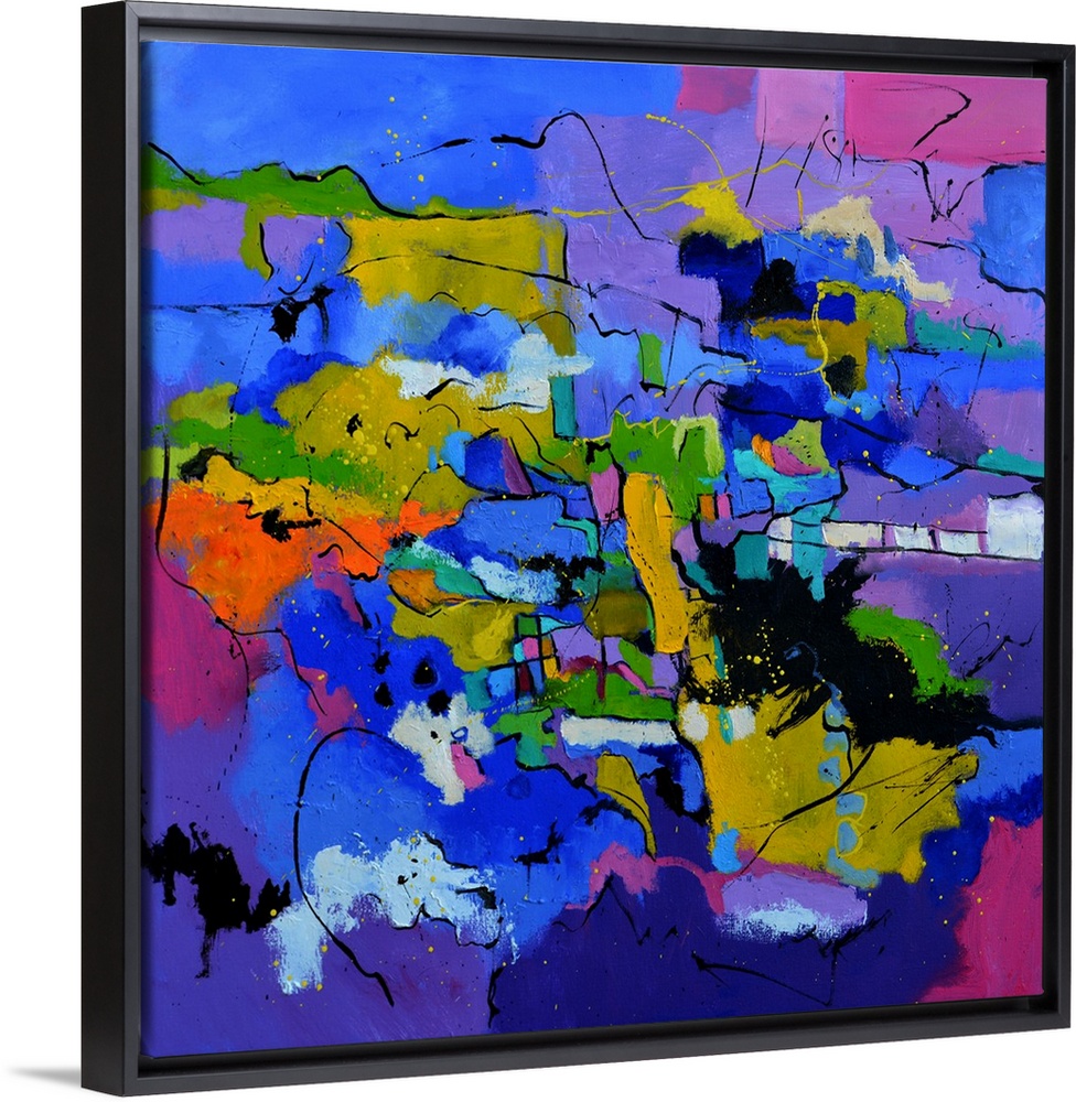 <p>A square abstract painting in dark shades of purple, blue, white and yellow with splatters of paint overlapping.</p>